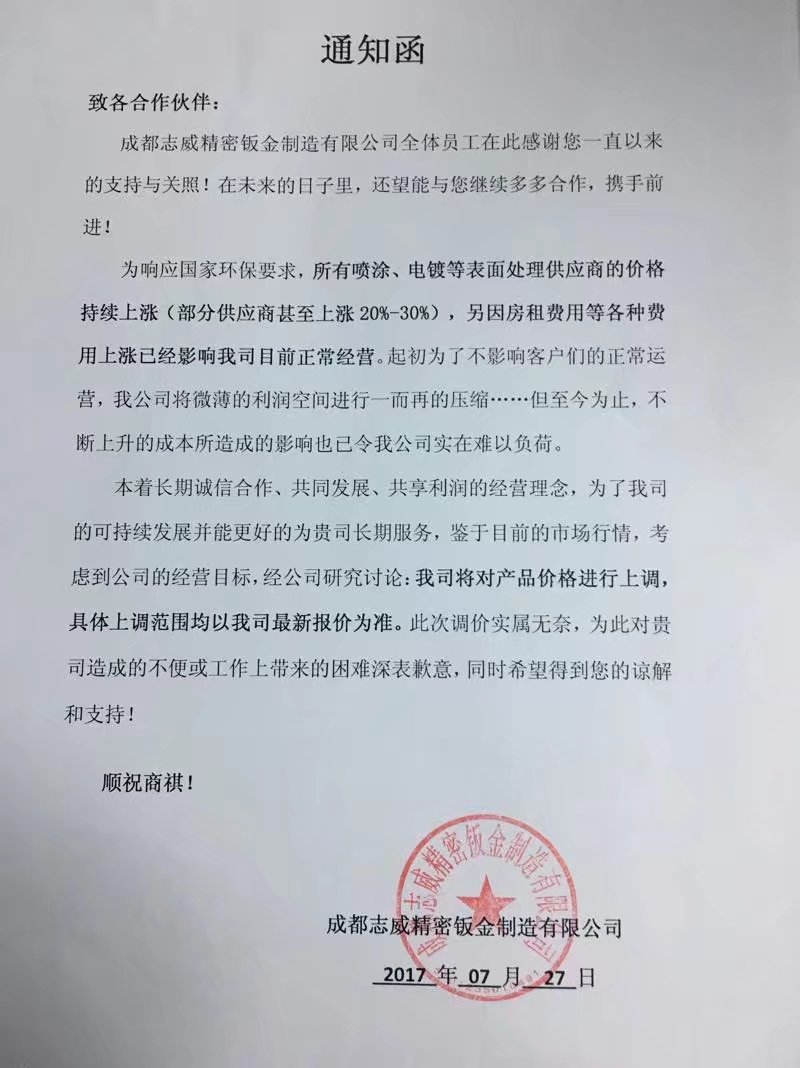 成都志威精密钣金制造有限公司全体员工在此感谢您一直以来的支持与关照!在未来的日子里,还望能与您继续多多合作,携手前进!此通知函的告知实属无奈,为此对贵司造成的不便或工作上带来的困难深表歉意,同时希望得到您的谅解和支持! 顺祝商祺!